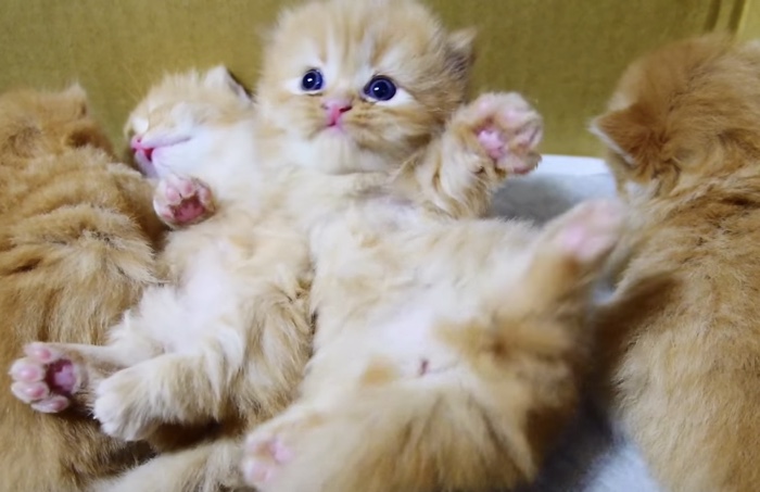こちら、マンチカンの子猫たち。 もれなくもふもふな子猫たちは、仲良くお昼寝中。 ただひとり、さかさまになっちゃってる子が。 どうにか起き上がろうとしてみますが... もふもふすぎて、コロンコロンしちゃって、起き上がれません。 かわいそうだけど、...