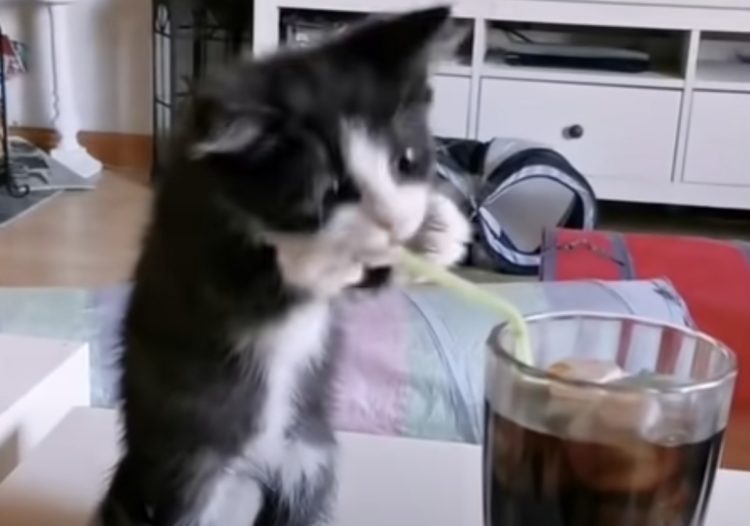 ストローを使ってみたい子猫、両手を使って四苦八苦!
