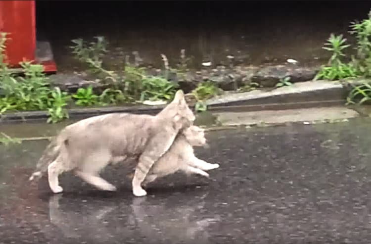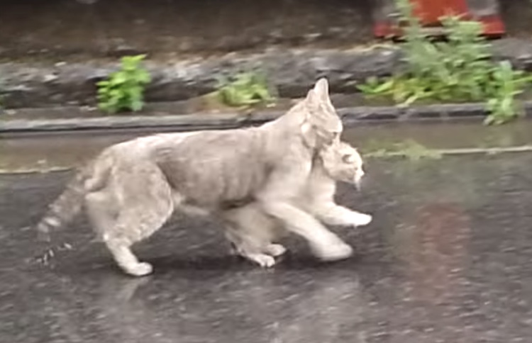 外で暮らす猫にとって、雨は避けたいもののひとつ。 大事な子猫が濡れて風邪をひいてしまってはいけません。 好奇心旺盛でまっすぐ帰ってくれなそうな子猫を、くわえておうちに戻るお母さん猫の動画です。 母の愛、つよし!