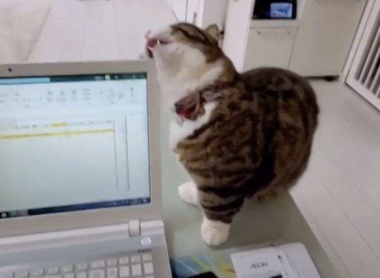 「これ美味しいのかニャ?」猫、パソコンを味見してみる。