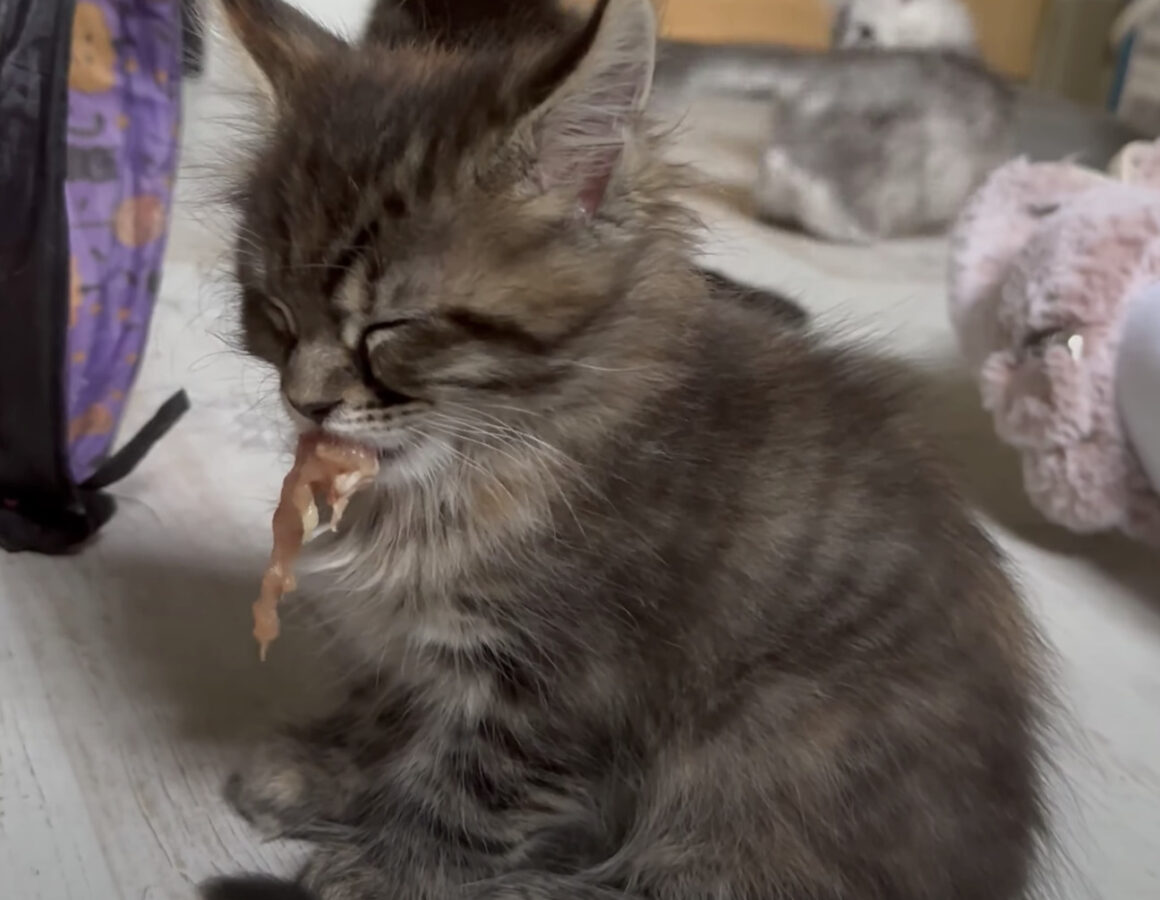 こちらは生後8週目になる子猫さん。 ようやく離乳食を始めたばかりで、 自分でお皿から、 鶏肉を食べているところ♪ 食欲も旺盛で、遊び盛りで よく寝る育ち盛りの子猫さんは ご飯を食べている時に、 睡魔に襲われちゃいました!! お口に鶏肉をぷら〜んとぶ... -