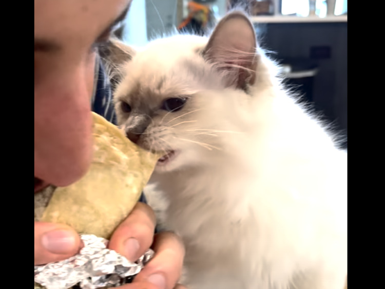 「絶対食べてやるっ!」ブリトーに執着する子猫。