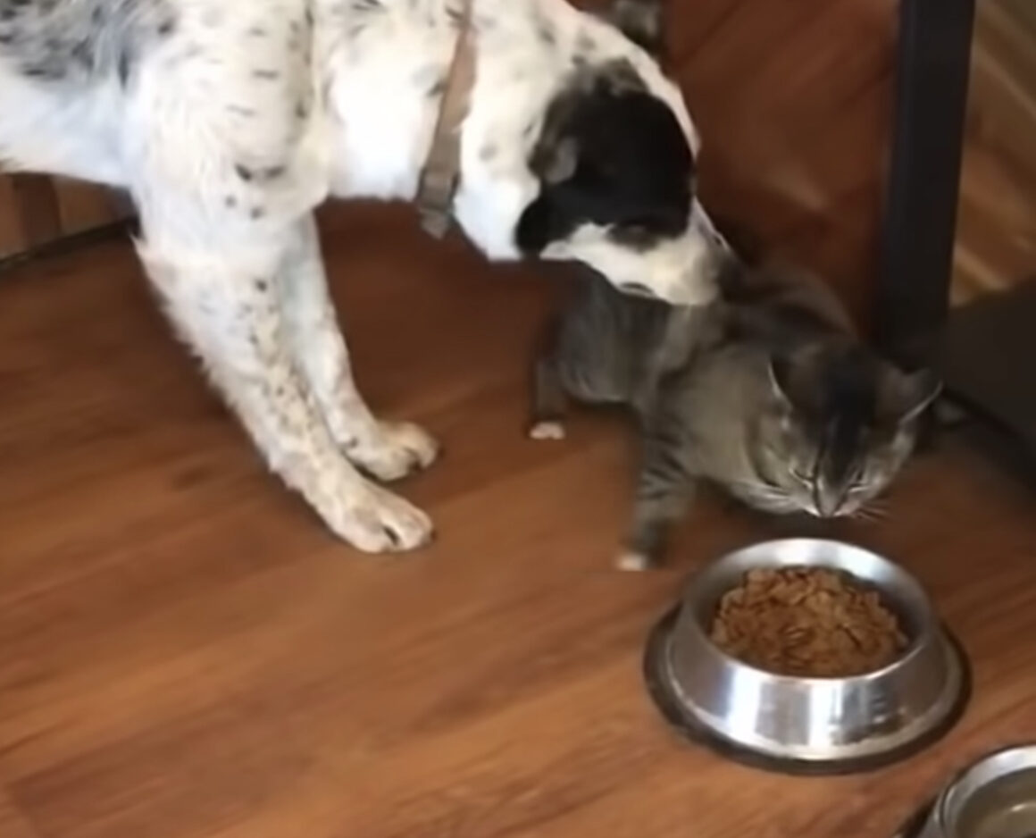 現行犯で確保〜! 犬のゴハンを盗み食いしていた猫、ついにバレる。