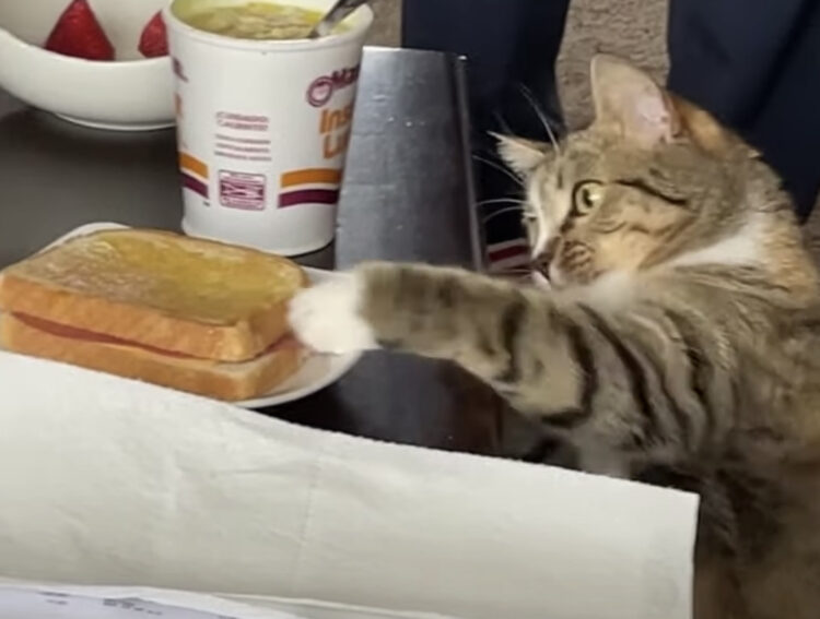 飼い主さんが用意した食事、 トーストをじーっと見つめている猫さん。 「おいしそうだにゃ...」と思いつつも 初めは我慢していたのですが... 手をぺろぺろしながら、 別になにもしていないアピールをする猫さん。 なんだか動きが怪しいな、と 飼い主さんが... -