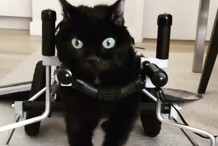 小脳障害の黒猫、歩行器を使って自分の脚で歩くニャ!