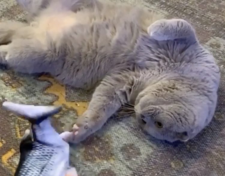 おもちゃ床にゴロンと転がっている猫さん。 眠っているわけではなく、 仰向けになって少し退屈しているみたい。 それなら、これが喜ぶんじゃ!と 飼い主さんが魚のおもちゃを渡すことに。 このおもちゃ、とってもリアルで 生きている魚のようにピチピチと... -