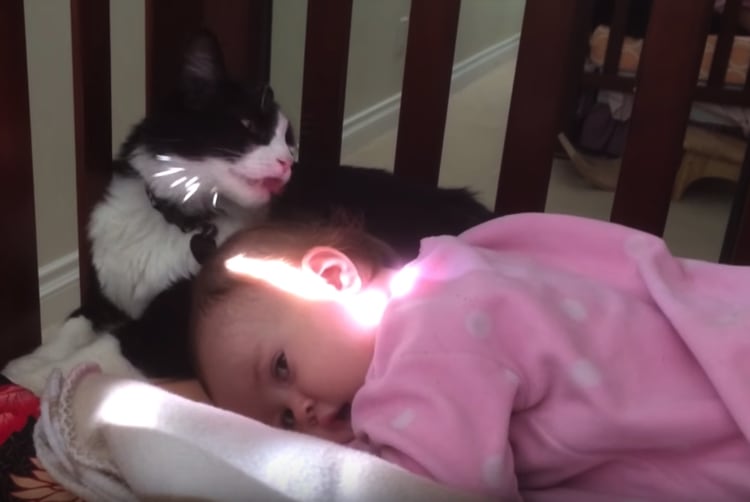 な、何もしてないよ? 見てないところで赤ちゃんを舐めまくる猫。