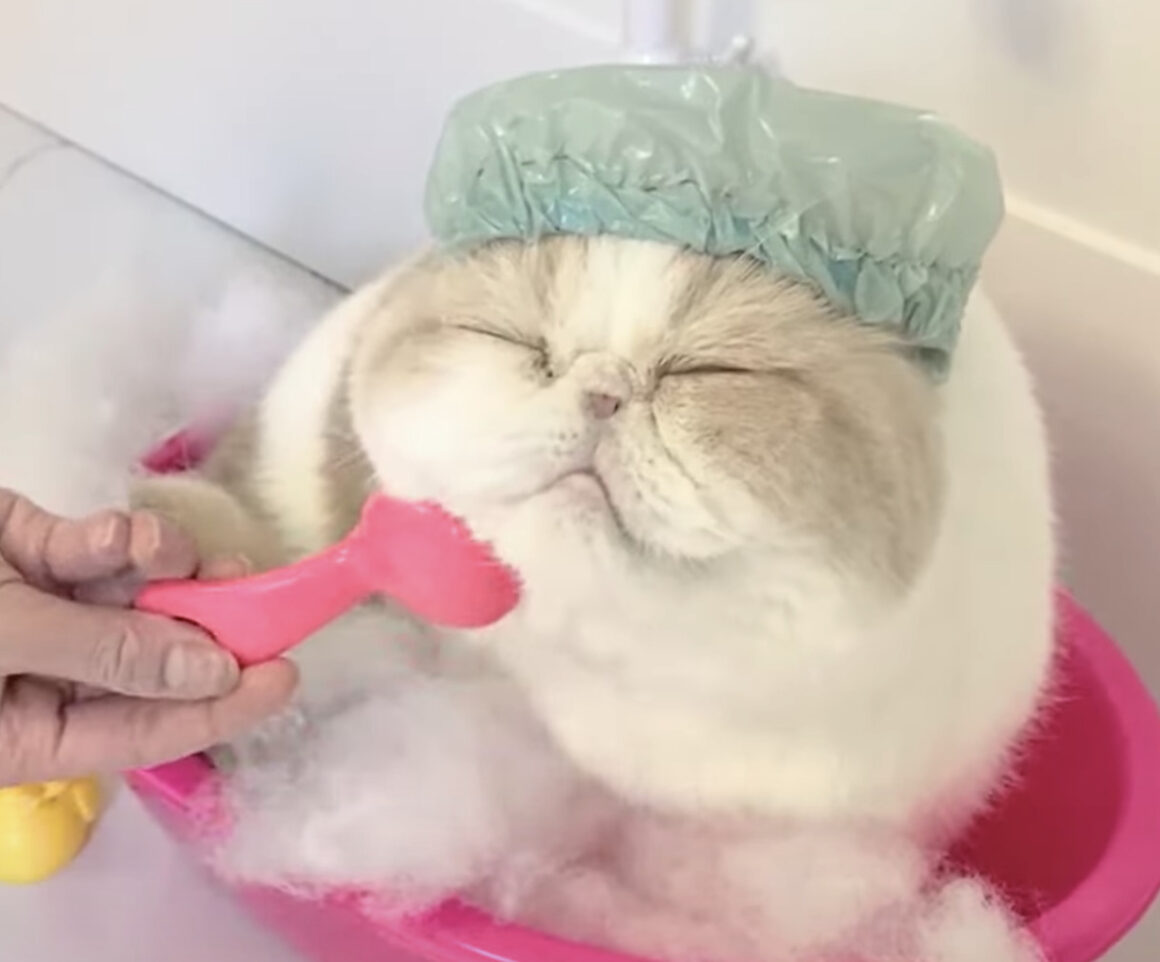 シャワーキャップをかぶっている、 エキゾチックショートヘアの猫さん♪ これから飼い主さんと一緒に お手入れの時間です。 猫さんの体にピッタリのバスタブで ゆった〜りとくつろぎながら 飼い主さんがブラッシング♪ 水嫌いなはずの猫さんなのに、 お風呂...