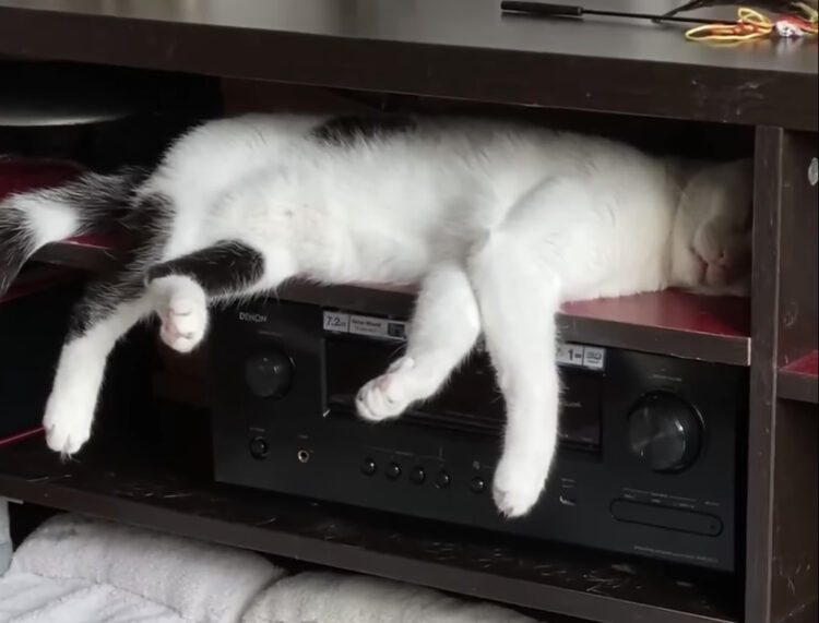 テレビ台の中に潜り込んで、 スヤスヤ眠っている猫さん。 猫と言えば「狭いところ」だもんね! 自分だけの個室のような ピッタリサイズの場所を見つけて 気持よさそうに眠っています♪ 手足はぶら〜んと放り出して、 完全にリラックスモード。 気持ち良さそ... -