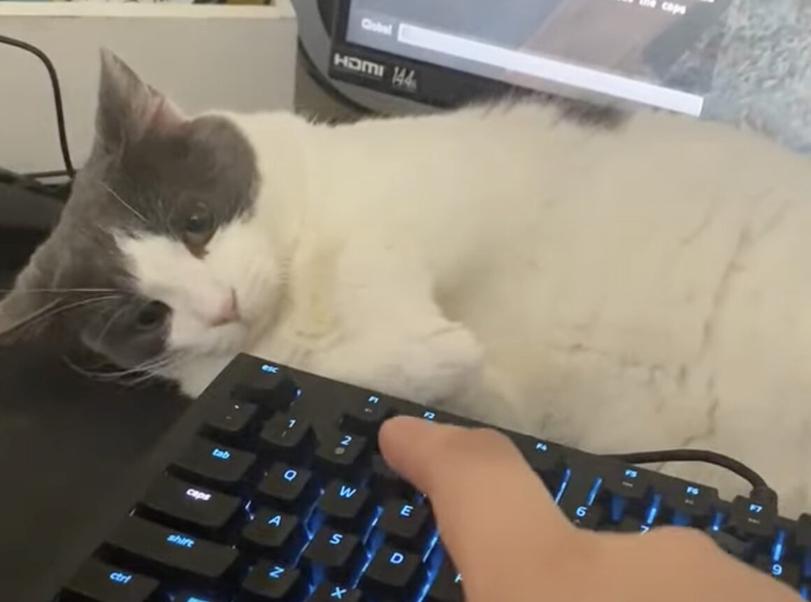 絶対キーボードは触らせにゃい…ゲームの邪魔をしちゃう猫。