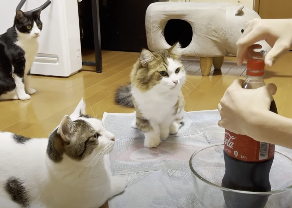 夏休みの自由研究♪ メントスコーラを猫達に見せてみると…