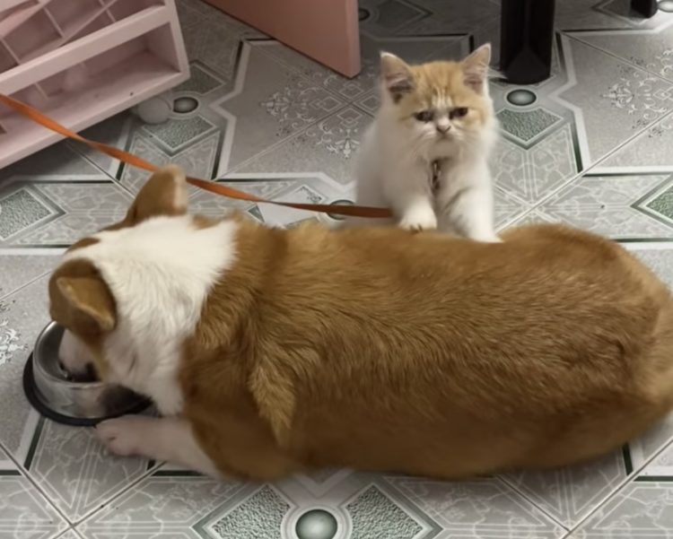 ゴハンを食べているコーギー犬の側で 両手を犬さんに乗せている子猫。 どうやら犬さんの腰をモミモミと マッサージしているようで、 子猫「揉んであげるから!ゴハン分けてよ!」と 何か見返りを求めているようにも見えますが 犬さんは反応もせずゴハンに...