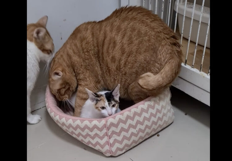 ピンク色の猫ベッドの中で 気持ちよさそうにくつろいでいる猫さん。 目を閉じてウトウト、これからお昼寝です。 と、そこにのっしのっしとやって来たのは、 同居している茶トラ猫さん。 お...大きい! 先に寝ていた猫さんの3倍くらい大きいんじゃ? いやい...