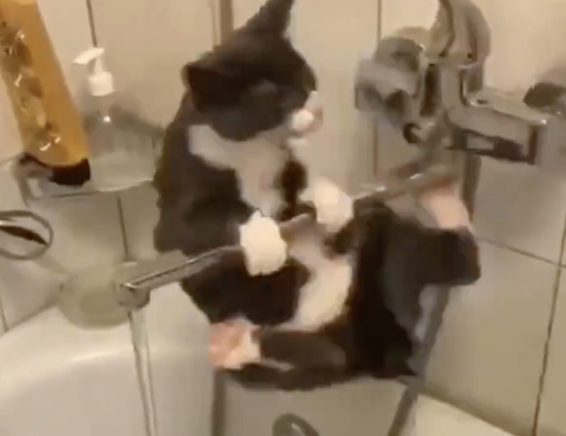 猫は流れる新鮮なお水が好き。 ということでこちらのお宅の猫さんも、 蛇口から直接お水を飲もうとして、 洗面台にやってきました。 手を伸ばしてお水をパシャパシャ...。 ちょっと体勢が不安定なようですが 猫さん大丈夫なのかな? 心配してみていると、...