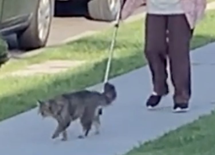 「ゆっくり行こうね」おばあちゃんの散歩に付き合う猫。