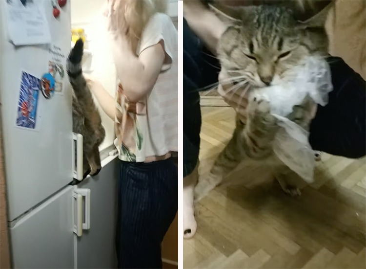 ポテトー!冷蔵庫を開けた瞬間に盗む、食いしん坊猫。