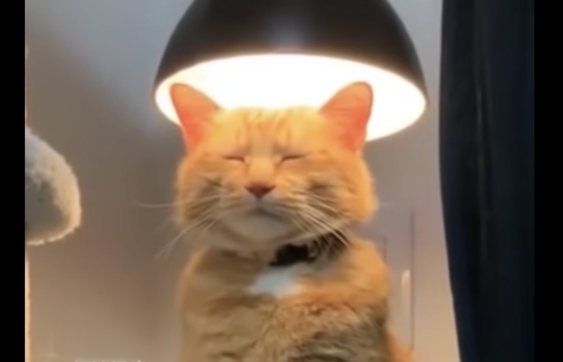 スポットライトを浴びている猫? 電球があったかいニャ〜♪