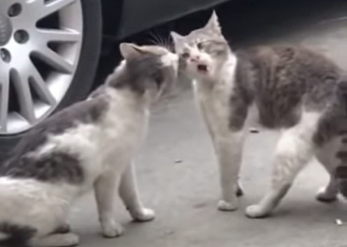 路上で向かい合っているのは 2匹の野良猫さん。 縄張りのことで喧嘩中?? 今にもバトルが始まりそうです。 その猫さんの睨みの効かせ方が、 足をぴーんと伸ばして出来るだけ体を大きく見せ、 顔をナナメにして「にゃ〜ん!?」と 下から相手の顔を覗くよう... -