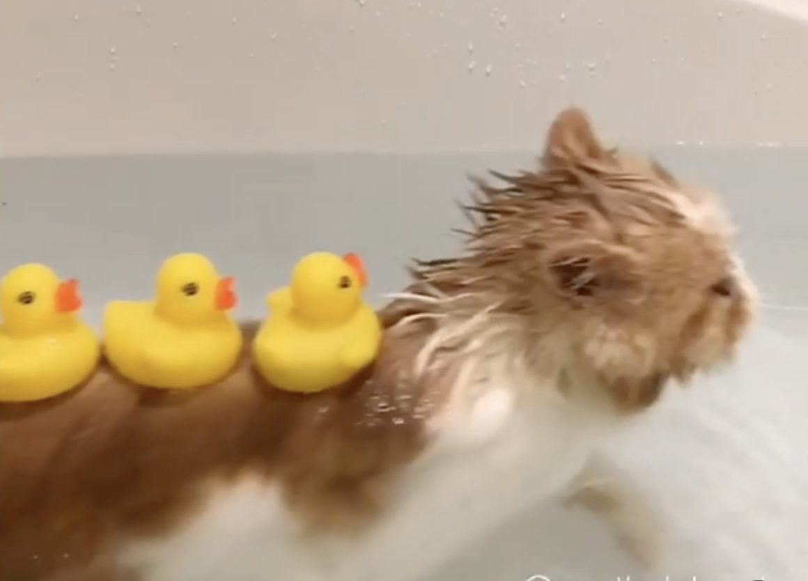 水中ウォーキング♪アヒルを乗せて楽しそうに入浴する猫。