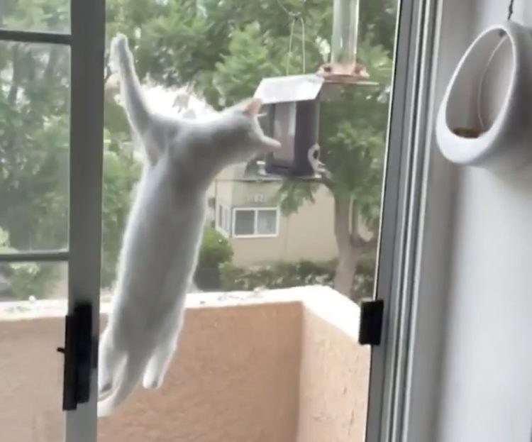 ベランダに鳥たちがやってこれるように バードフィーダー(餌台)を置いているお宅。 毎朝鳥たちがやってきて、 餌を美味しそうに食べていくのですが、 それを近くで見たくてしょうがないのが、 白猫のプリンセスさん。 網戸によじ登り、首を伸ばして 鳥が... -