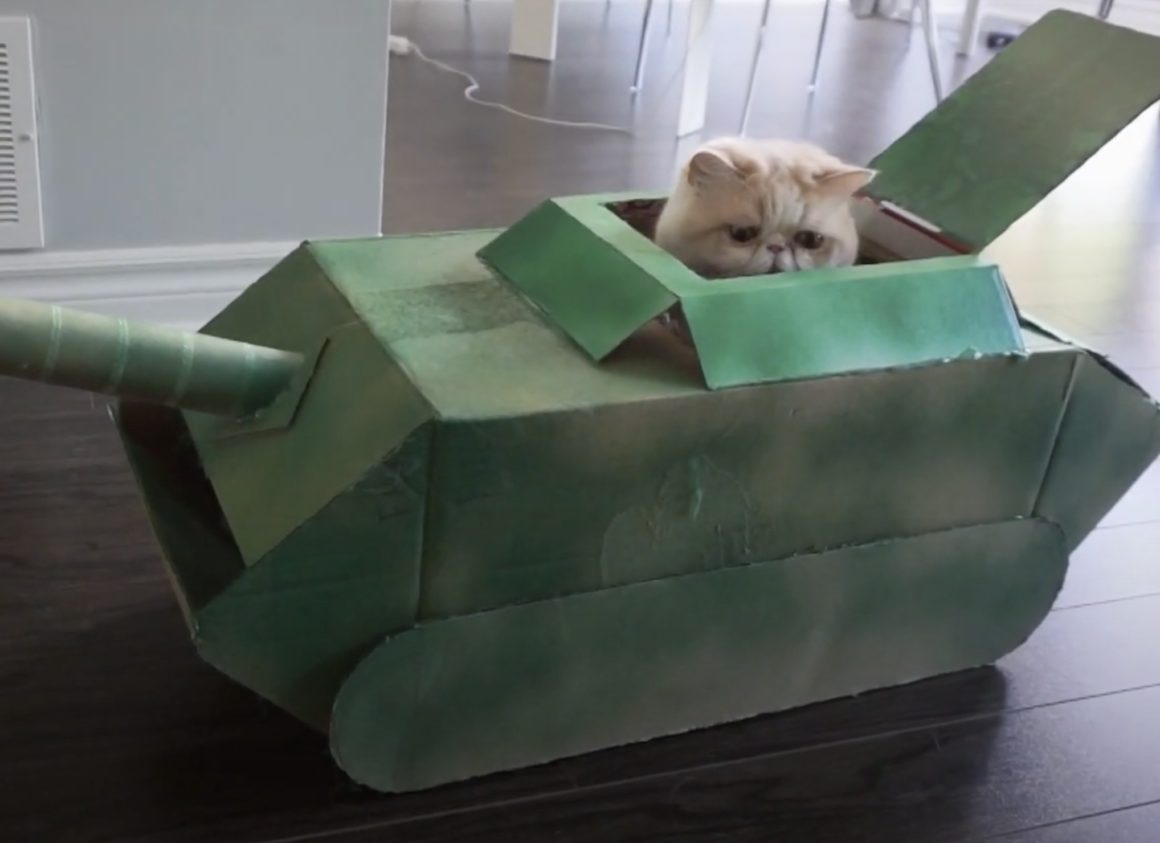 ダンボールや箱の狭い場所、 自分だけの空間が大好きな猫さん。 そんな猫さんに喜んでもらおうと 飼い主さんがダンボールで 猫さんが喜んでくれそうな場所を創作! なぜか、形が戦車の隠れ家です。 どうしてこの形なのかは謎ですが、 操縦席に座っている猫... -