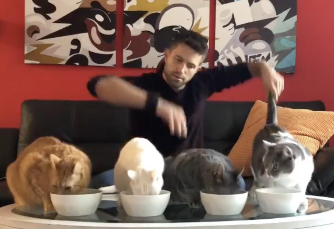 4匹の猫ちゃんを飼っている男性。 みんないつも同じ時間に同時に 食事をとるので、ゴハンの時間は 少しだけ飼い主さんは退屈。 猫さんたちは夢中でゴハンを食べています。 そこで、退屈しのぎに飼い主さんが 突然猫さんたちのお尻をポンポンして エア演奏... -