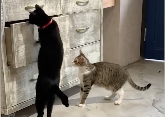 おしゃれなタンスが気になる猫さんたち。 引き出しの一つ一つが大きいけれど 一体何が入っているのかな? 2匹で一緒に、引き出しを開けようと いろいろ試していたところ、 黒猫さんが取手を掴むことに成功!! 黒猫「お?開いたよ!中を見てくる!」と 引... -