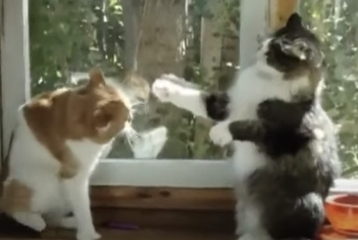 ボクシングのようなポーズで構える猫、勝負の行方は…