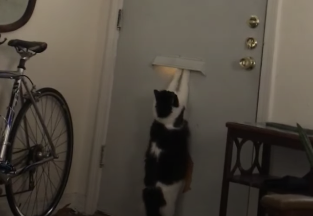 絶対入れさせにゃい!郵便配達員を困らせる猫さん。