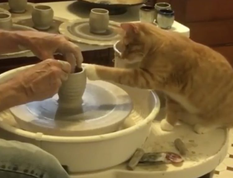 陶芸をしている男性。 回っているろくろの側では 猫さんがじーっと、 男性の作品を見つめています。 クルクル回っている作品が気になったのか 急に手を伸ばして、粘土を優しくチョンチョン... 男性がびっくりして作品作りの手を止めると 猫「ここは、こう...