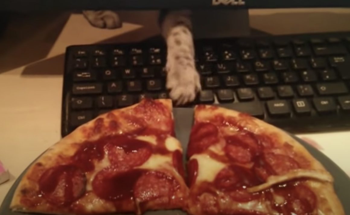 パソコンの隙間からにゅっ!大胆な犯行のピザ泥棒。