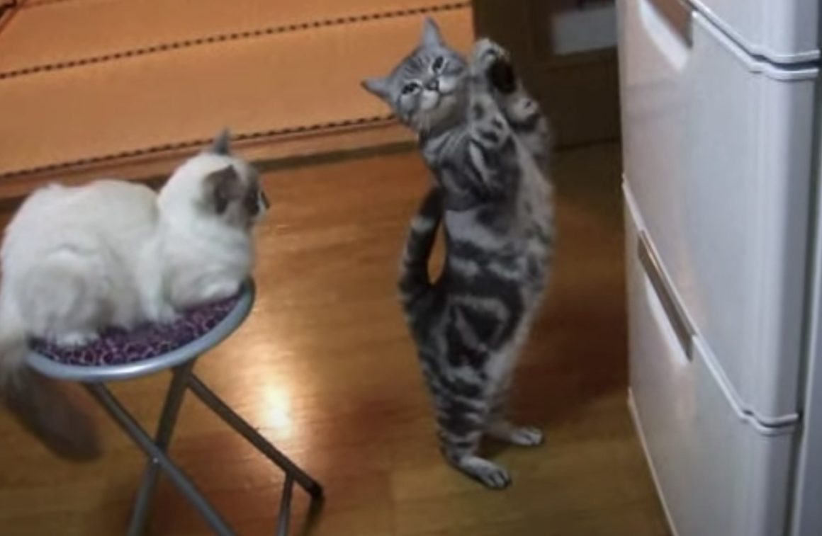 「開きますように!」冷蔵庫の前で立ち上がってお願いポーズをする猫さん。