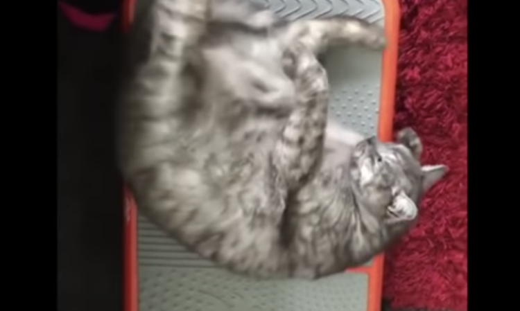 仰向けになって、 寝転んでいる猫さん。 寝ている場所が、普通の床じゃなくて ブルブルするダイエットマシーンの上! ブルブルしながら痩せるための 飼い主さんの機械なんですが ご覧の通り猫さんが占領。 絶対眠りづらい場所なのに ゴロンとなってくつろ...
