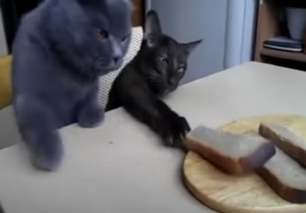 食卓テーブルのイスに座って、 パンを見つめている2匹の猫さん。 飼い主さんの隙を見てパンを狙っているようで、 灰色の猫さんが積極的に手を伸ばして パンを取ろうとしますが、 すぐに飼い主さんに取り戻されちゃった。 もう1匹の黒猫さんも、パンの強... -