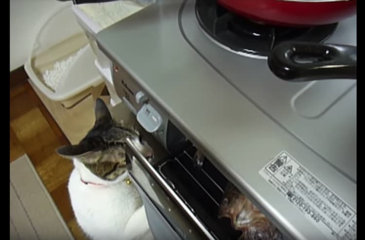 お魚くわえたどら猫…なるか?グリルの焼き魚を狙う猫。