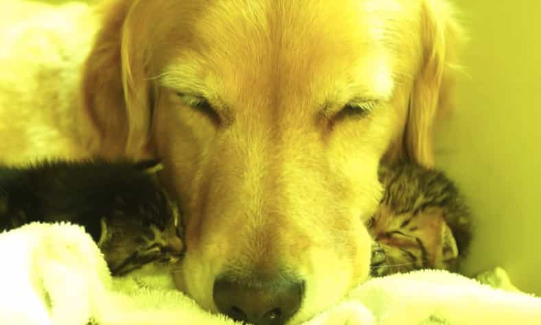 ぎゃ〜犬に押しつぶされる!子猫「ぼく、ここにいるよう」