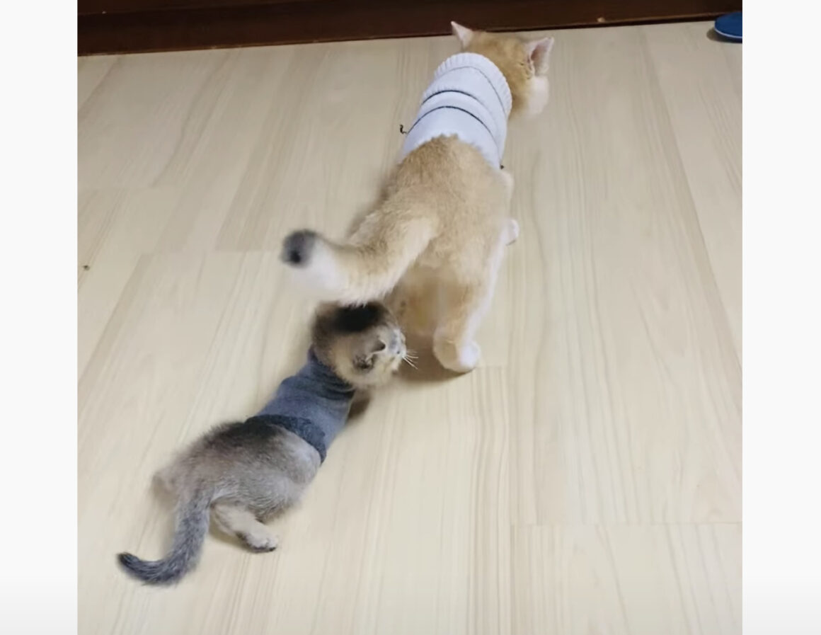トコトコ歩いている大人の猫さんに ずーっとくっついている子猫さん。 遊んでいるのかなと思ったら、 何かがおかしいのです。 実は、大人猫さんが着ているお洋服に 子猫さんの爪がひっかかって 取れなくなってずーっとズルズル! 大人猫さんが移動するたび... -