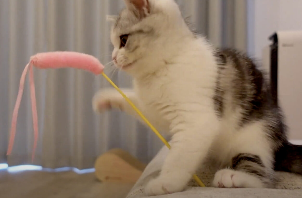 ひとりで遊べるかな?「セルフ猫じゃらし」ではしゃぐ子猫。