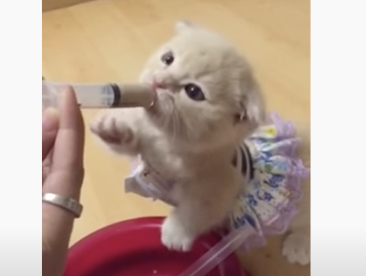 もっとちょ〜だい!スカートを着て注射器で食事する子猫