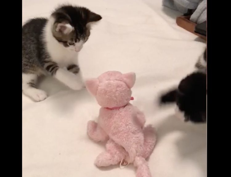 ベッドの上に、ぽつんと置かれたぬいぐるみ。 ピンク色の猫さんで、子猫たちのとっての いい遊び相手になりそう! そう思っていた飼い主さんでしたが... 子猫さん達は見慣れないぬいぐるみに 警戒心全開で攻撃開始! 1匹は頭を集中攻撃で猫パンチ。 もう1... -