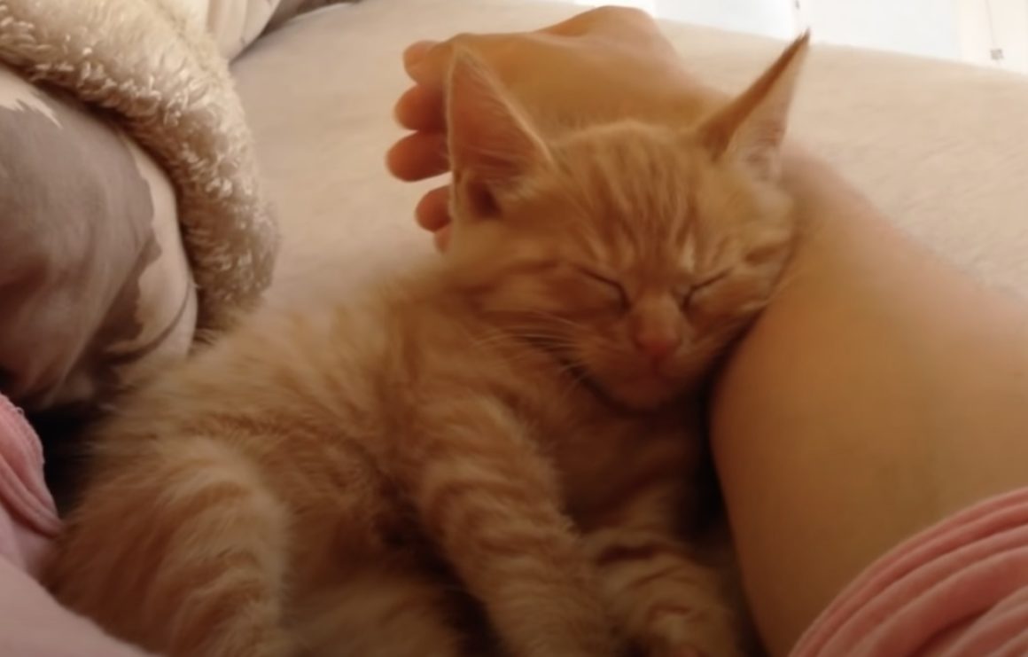 飼い主さんの腕枕でぐっすり眠る子猫。
