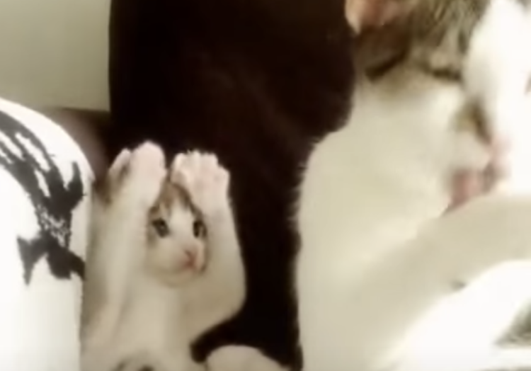 「こうかニャ?」母猫の毛づくろいの真似をする子猫。