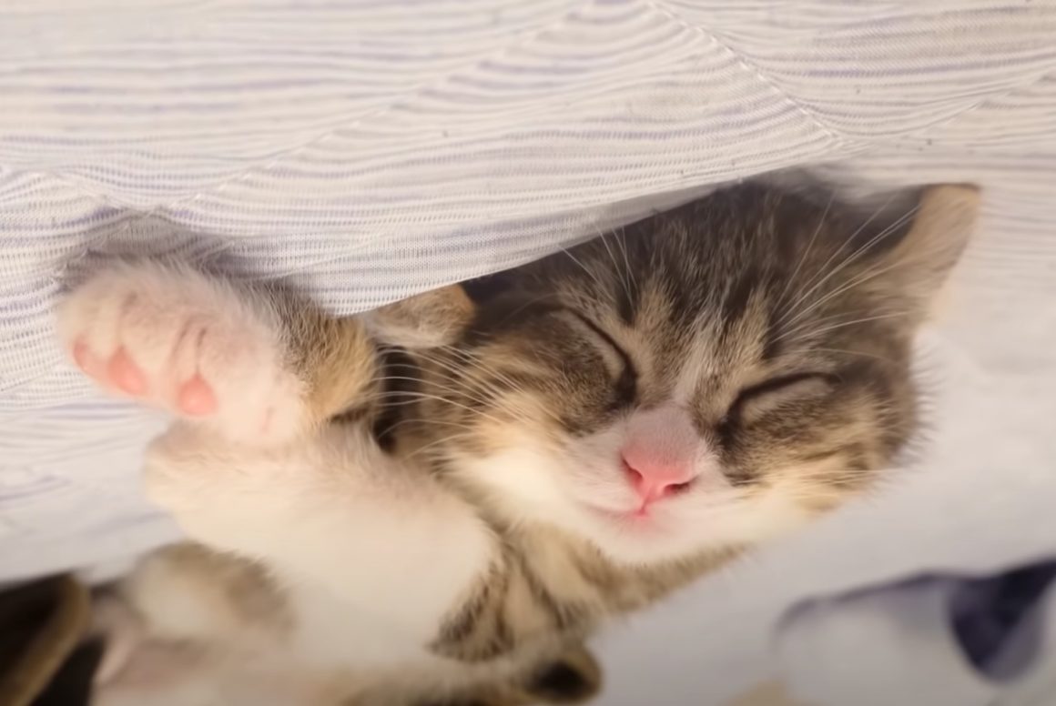 ひんやりマットでくつろぐ子猫。幸せそうにスヤスヤ。