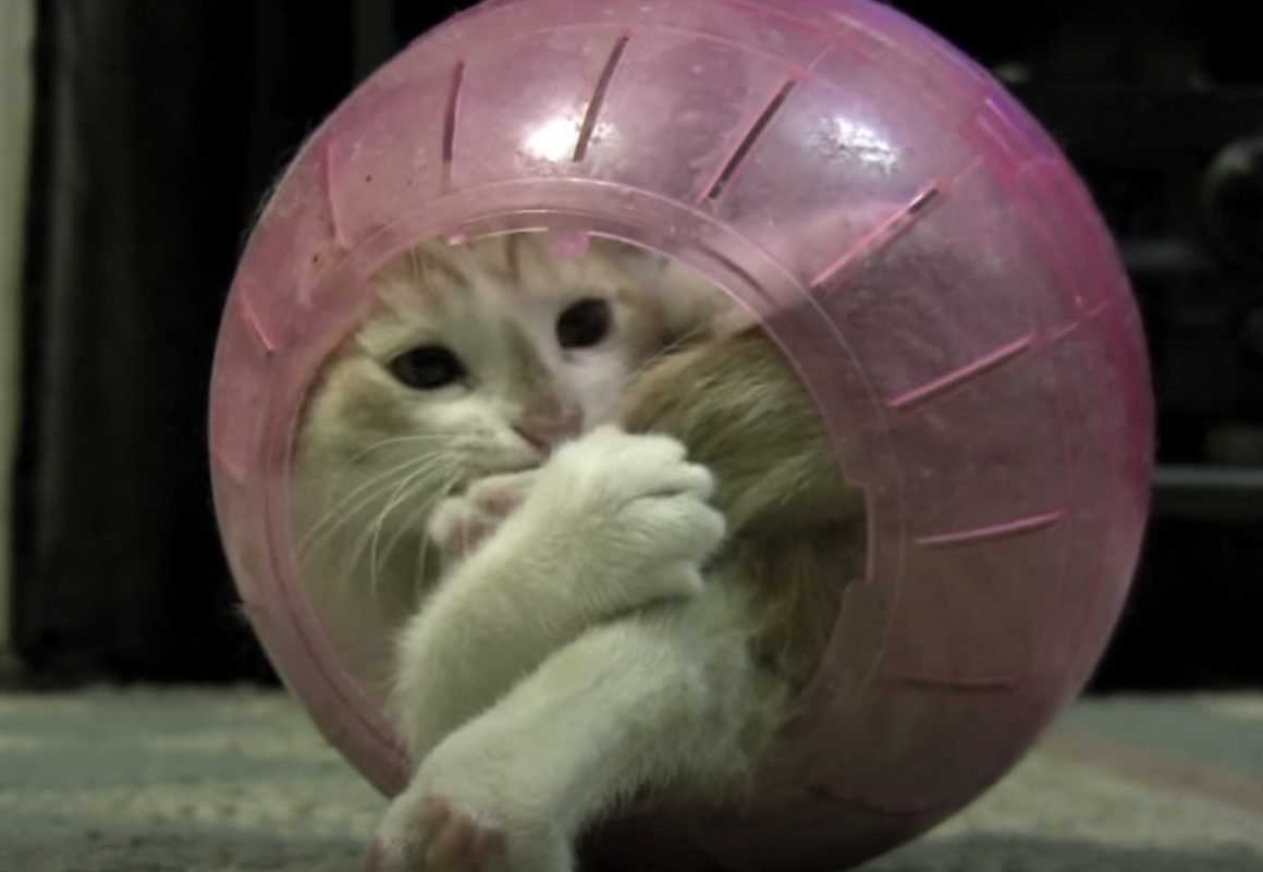 ハムスターボールに子猫がすっぽり! ポ○モンってこんな感じなのかなぁ。