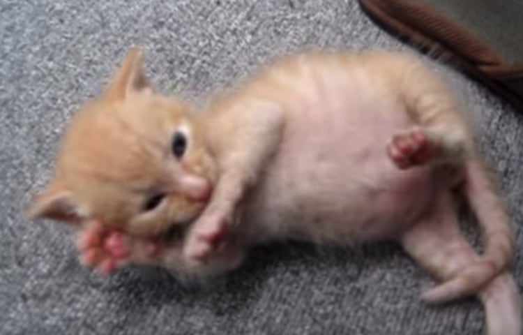 ミルクでおなかぽんぽん!お耳を掻こうとして2回転しちゃった子猫。