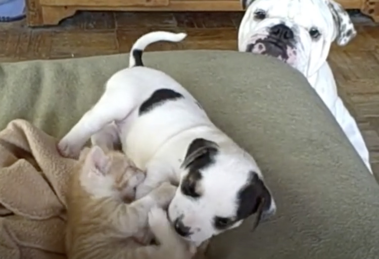 遊んでいる子猫と子犬。…を覗いているブルドッグさん。