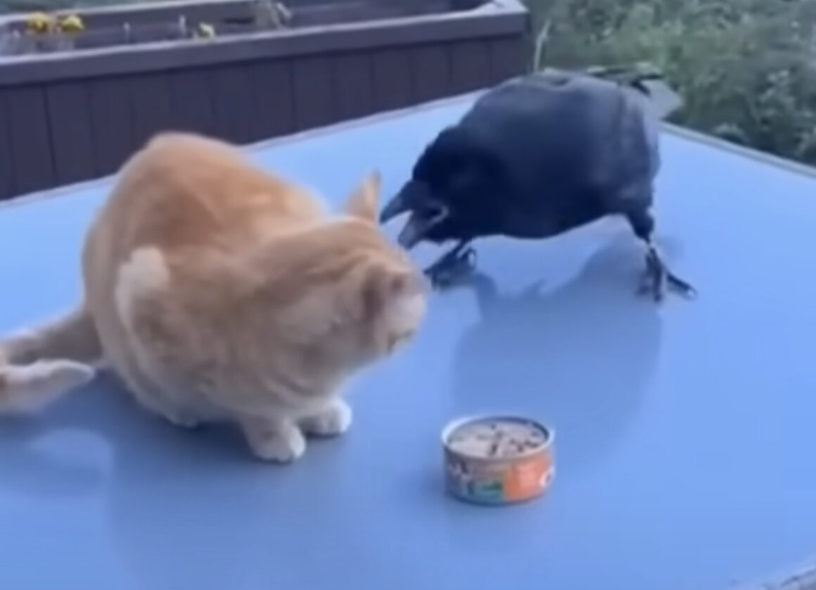 テーブルにポツンと置かれた缶詰。 茶トラの猫さんに与えようと 撮影者さんが置いたのでしょうか。 そこに大きなカラスが登場!! エサを狙っているようで、 これはバトルが始まる...? しかし猫さんは、缶詰を取られても そんなに焦った様子もなく じーっ... -