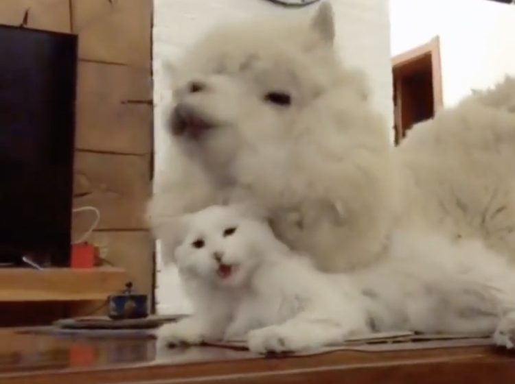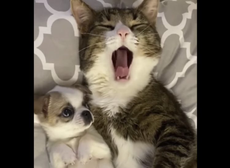 とっても仲良しな猫と子犬。「一緒にお昼寝しよっか〜!」
