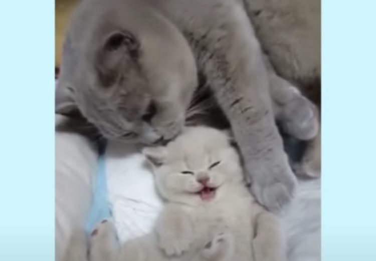 母猫「こうやって洗うのよ〜」母猫を真似して洗顔レッスンが可愛すぎ!
