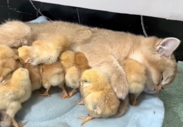 ヒヨコをハグしながらお昼寝する猫さん♪